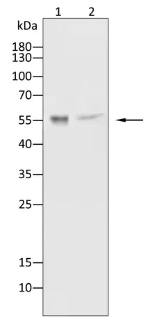 Western blot analysis using HEXB antibody against THp-1 (1),A431(2) cell lysate.