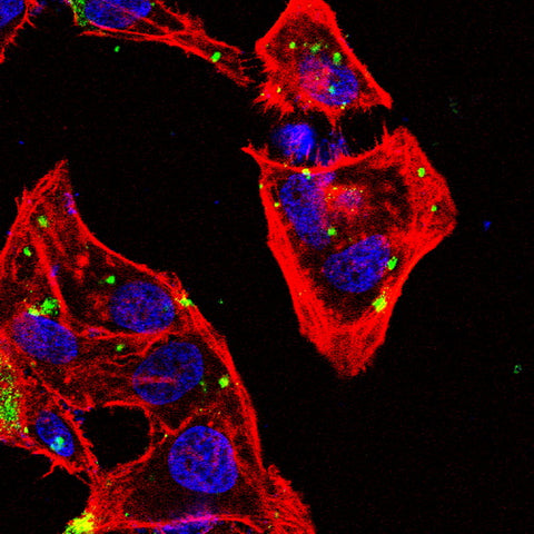 Immunofluorescence analysis of Hela cells using HEXB antibody (green). Blue: DAPI fluorescent DNA dye. Red: Actin filaments have been labeled with Alexa Fluor- 555 phalloidin.