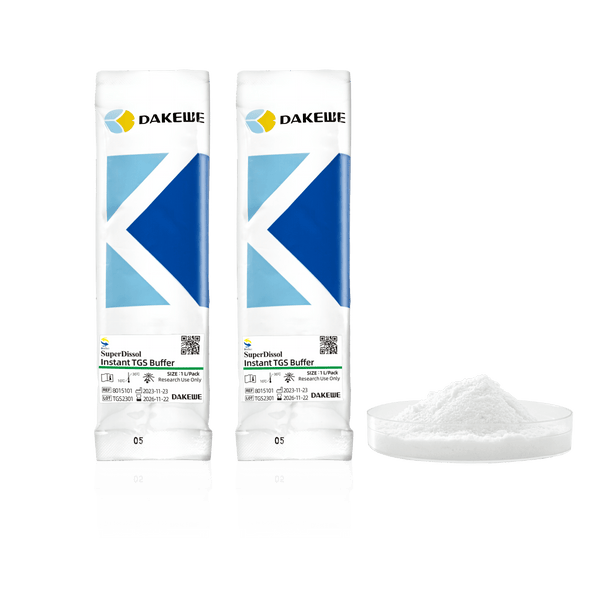 SuperDissol Instant TGS Buffer is white to off-white instant granules, and each pack of this product can produce 1 L of 1 ×TGS Buffer, which is easy to operate and use. The main components of TGS are Tris, glycine and SDS. The concentration of Tris and glycine in 1 ×TGS Buffer is 25 mM and 192 mM, and the content of SDS is 0.1%. Instant TGS Buffer is commonly used as electrophoresis buffer for SDS-PAGE.