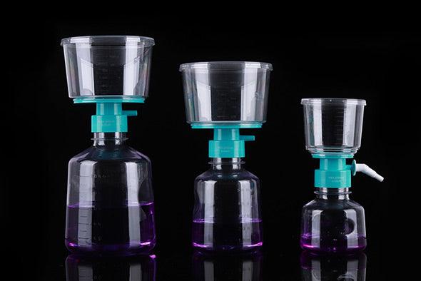 NEST Disposable Vacuum Filtration System is useful for large volume sample separation and sterilization of tissue culture media and other biological buffers. The units include PES or PVDF membrane filters with graduated filter tops made with polystyrene, and acrylonitrile-butadiene-styrene necks with polystyrene receiving bottles. A separated sterile polyethylene cap is included. Filtration system is manufactured from raw material of high transparency polystyrene (PS) in three different volumes: 250/500/1000 mL. They are available in three styles: complete filter/storage bottle systems, bottle top filters, and receiving bottles only.