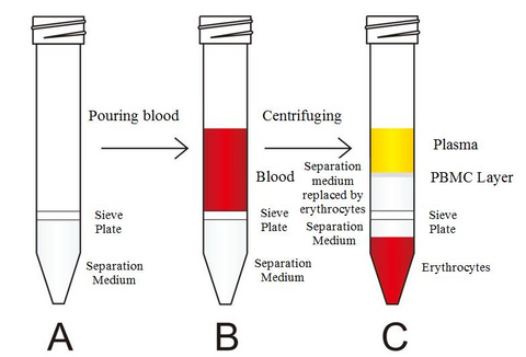 This product is used for cell separation and purification by density gradient sedimentation according to the differences in cell densities with the help of the separation medium and centrifugation. The cell gradient density separation medium produces a certain density gradient to pour the anticoagulant blood into the separation tube. After centrifugation, erythrocytes and granulocytes sink to the bottom of the tube; PBMCs (peripheral blood mononuclear cells, including lymphocytes and monocytes) float on the surface of the separation medium, and a small part of cells may suspend in the separation medium. Lymphocytes can be separated from the peripheral blood by absorbing the cells on the surface of the separation medium.