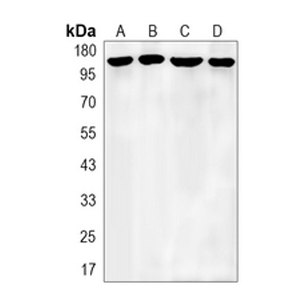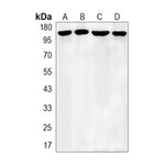 Western blot analysis of APC expression in Hela (A), A549 (B), HL60 (C), U2OS (D) whole cell lysates. (Predicted band size: 312 kD; Observed band size: 160 kD)