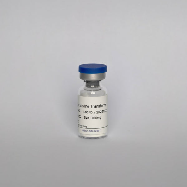 Transferrin is an important glycoprotein composed of two domains, each containing an iron-binding site—one at the N-terminus and one at the C-terminus. Each site can bind one Fe³⁺ ion with the cooperative involvement of one HCO₃⁻ ion. Its primary role is to transport and regulate iron metabolism, delivering iron to cells in a safe manner that avoids the toxicity associated with free iron ions. Iron is an essential cofactor for haemoglobin synthesis, electron transport chain components (such as cytochromes), and DNA synthesis enzymes, making it particularly critical for highly proliferative cells like cancer cells and stem cells. As a key additive in serum-free culture media, transferrin can substitute for serum as an iron source, ensuring cell survival and growth.
