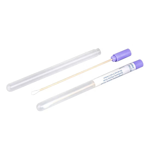 The product (item No. G1022) is called Swab with Plain Tube. Products are mainly used in collecting clinical secretions from the male urethra, female vagina, mouth, nasopharynx, and anus. The specification of the tube is 13 × 150 mm. The plug is made of polyethylene (PE), the plastic tube is made of low-density polyethylene (LDPE), the head is made of flock, and the rod is made of ABS. All materials used for the products are clean, safe, and easy to use.